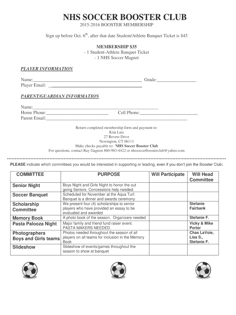 NHS SOCCER BOOSTER CLUB 20152016 BOOSTER MEMBERSHIP Sign up before Oct. 6th, after that date Student/Athlete Banquet Ticket is $45 MEMBERSHIP $35 1 StudentAthlete Banquet Ticket 1 NHS Soccer Magnet