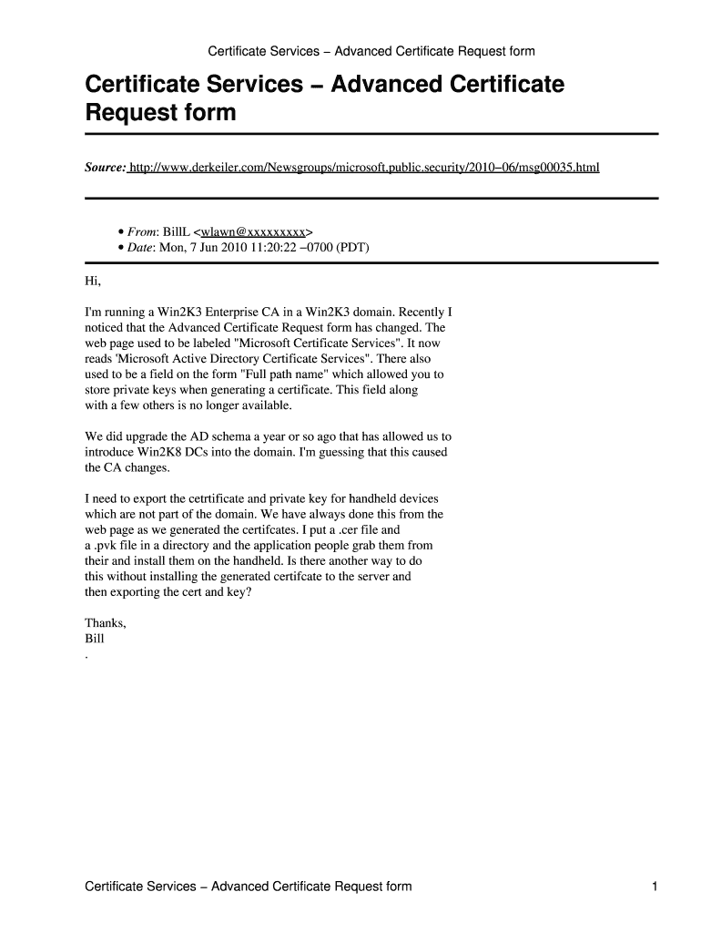 This document discusses changes to the Advanced Certificate Request form in Microsoft Active Directory Certificate Services and addresses user queries regarding certificate export processes.