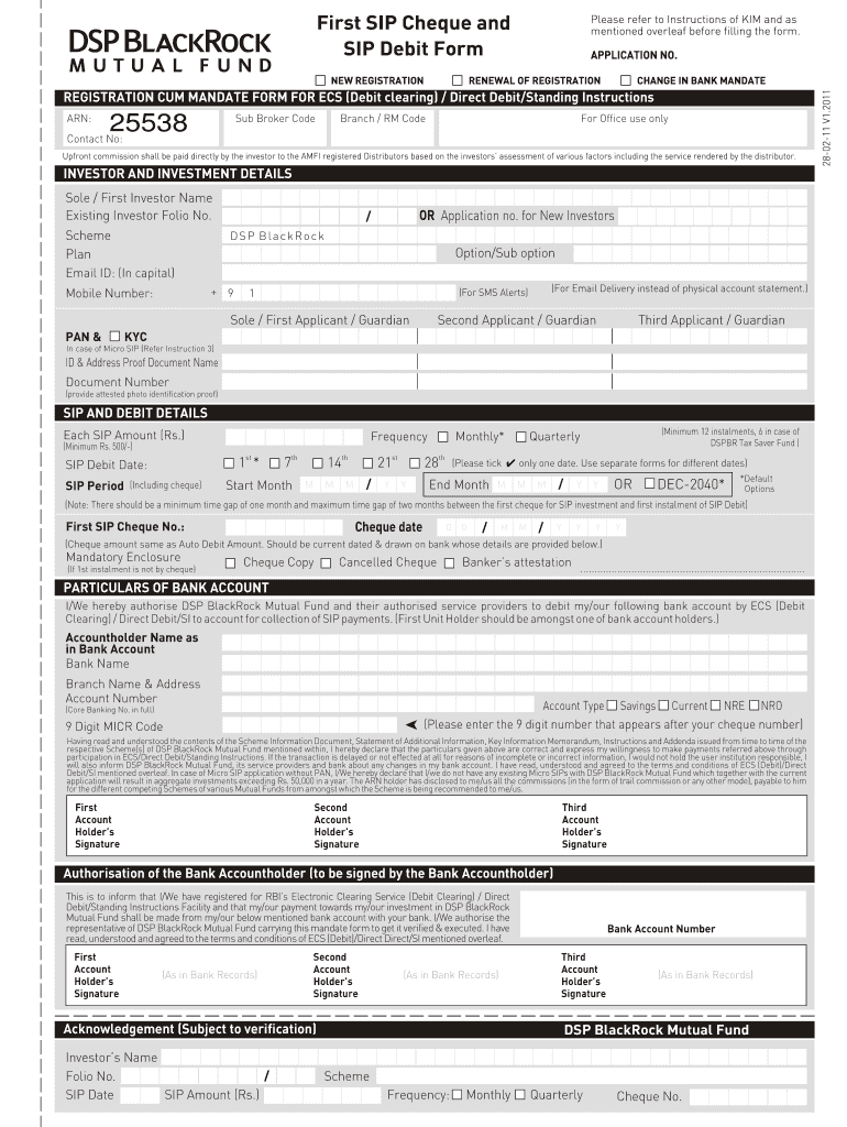 First SIP Check and SIP Debit Form APPLICATION NO. RENEWAL OF REGISTRATION CHANGE IN BANK MANDATE REGISTRATION Come MANDATE FORM FOR ECS (Debit clearing) / Direct Debit/Standing Instructions 25538