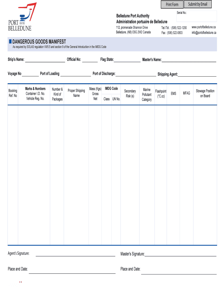 Submit by Email Print Form Serial No.: Belle dune Port Authority Administration portière de Belle dune 112, promenade Shannon Drive Belle dune, (NB) E8G 2W2 Canada Tel./Tl. : (506) 5221200 Fax :