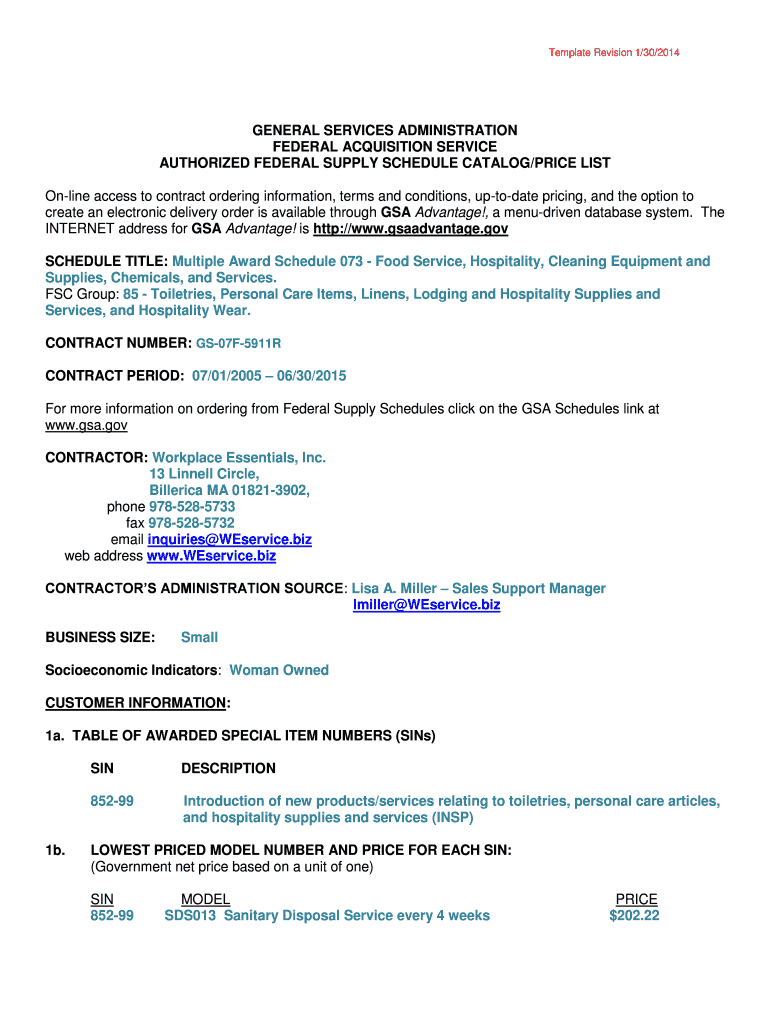 Template Revision 1/30/2014 GENERAL SERVICES ADMINISTRATION FEDERAL ACQUISITION SERVICE AUTHORIZED FEDERAL SUPPLY SCHEDULE CATALOG/PRICE LIST Online access to contract ordering information, terms