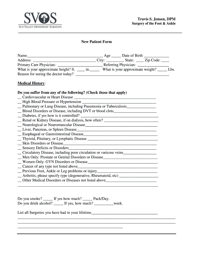 Travis S. Jensen, PM Surgery of the Foot & Ankle New Patient Form Name Age Date of Birth Address: City: State: Zip Code: Primary Care Physician: Referring Physician: What is your approximate height?