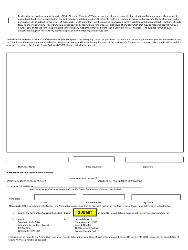Complete all the required fields on the form. This may include personal information, professional history, relevant experience, and a statement explaining why you believe the nominee is suitable for the position.