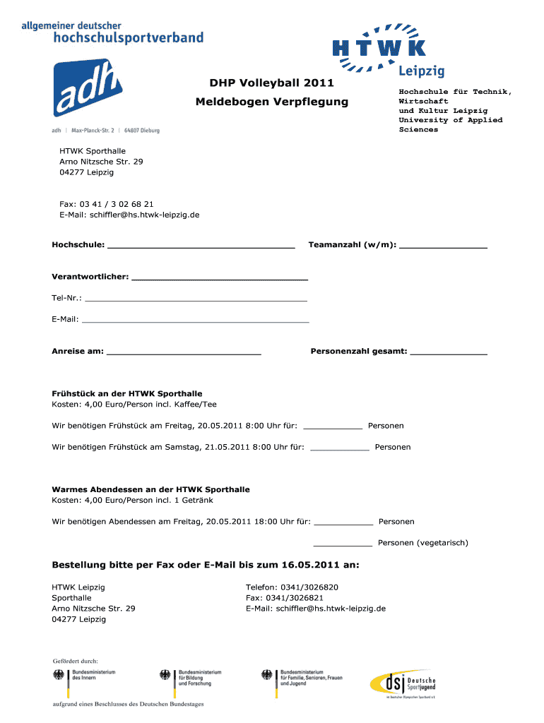 DHP Volleyball 2011 Meldebogen Verpflegung Hochschule for Technic, Airshaft UND Culture Leipzig University of Applied Sciences HAWK Sportable Arno Nietzsche STR. 29 04277 Leipzig Fax: 03 41 / 3 02