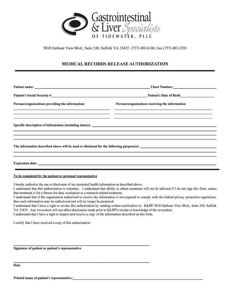 5818 Harbor View Blvd., Suite 240, Suffolk VA 23435 (757) 4836100, Fax (757) 4832203 MEDICAL RECORDS RELEASE AUTHORIZATION Patient name: Chart Number: Patients Social Security # Patients Date of Birth