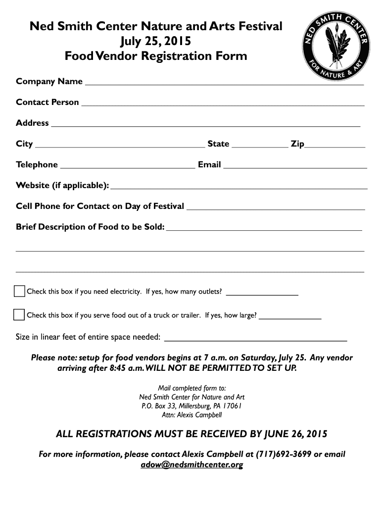 Ned Smith Center Nature and Arts Festival July 25, 2015, Food Vendor Registration Form Company Name Contact Person Address City State Zip Telephone Email Website (if applicable): Cell Phone for Contact