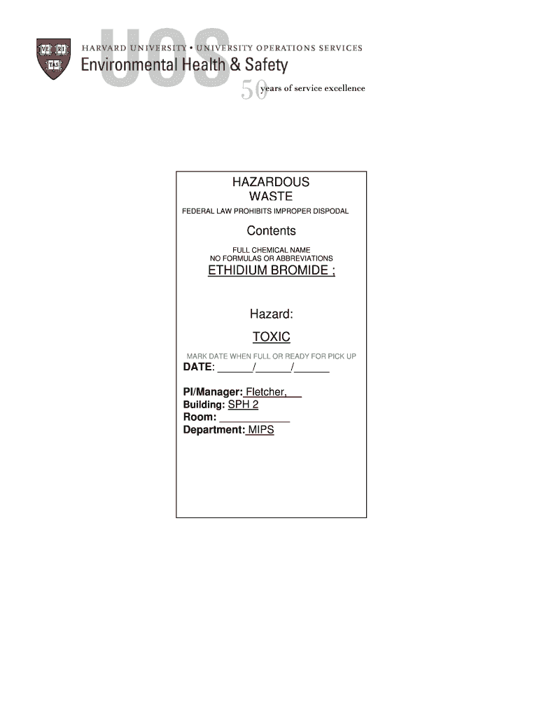 50 years of service excellence HAZARDOUS WASTE FEDERAL LAW PROHIBITS IMPROPER DISPOSAL Contents FULL CHEMICAL NAME NO FORMULAS OR ABBREVIATIONS STADIUM BROMIDE ; Hazard: TOXIC MARK DATE WHEN FULL