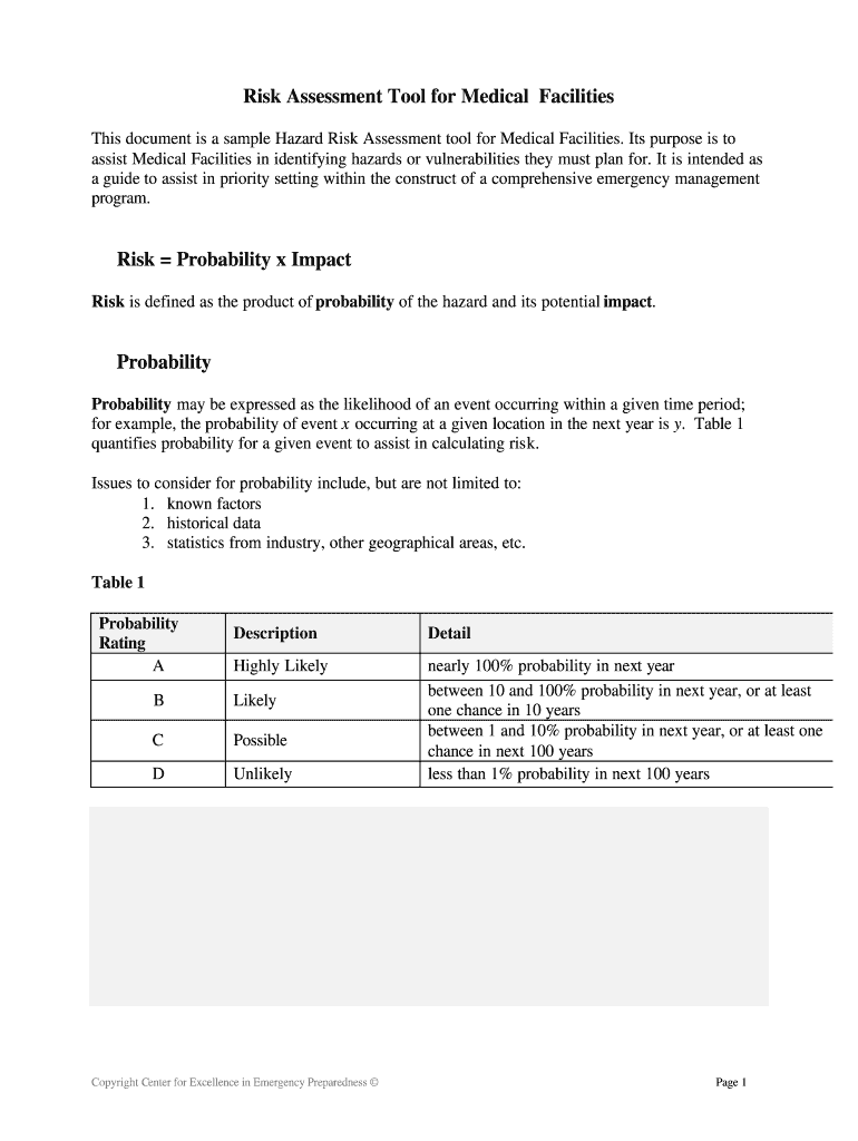 Risk Assessment Tool for Medical Facilities This document is a sample Hazard Risk Assessment tool for Medical Facilities. Its purpose is to assist Medical Facilities in identifying hazards or vulnerabilities