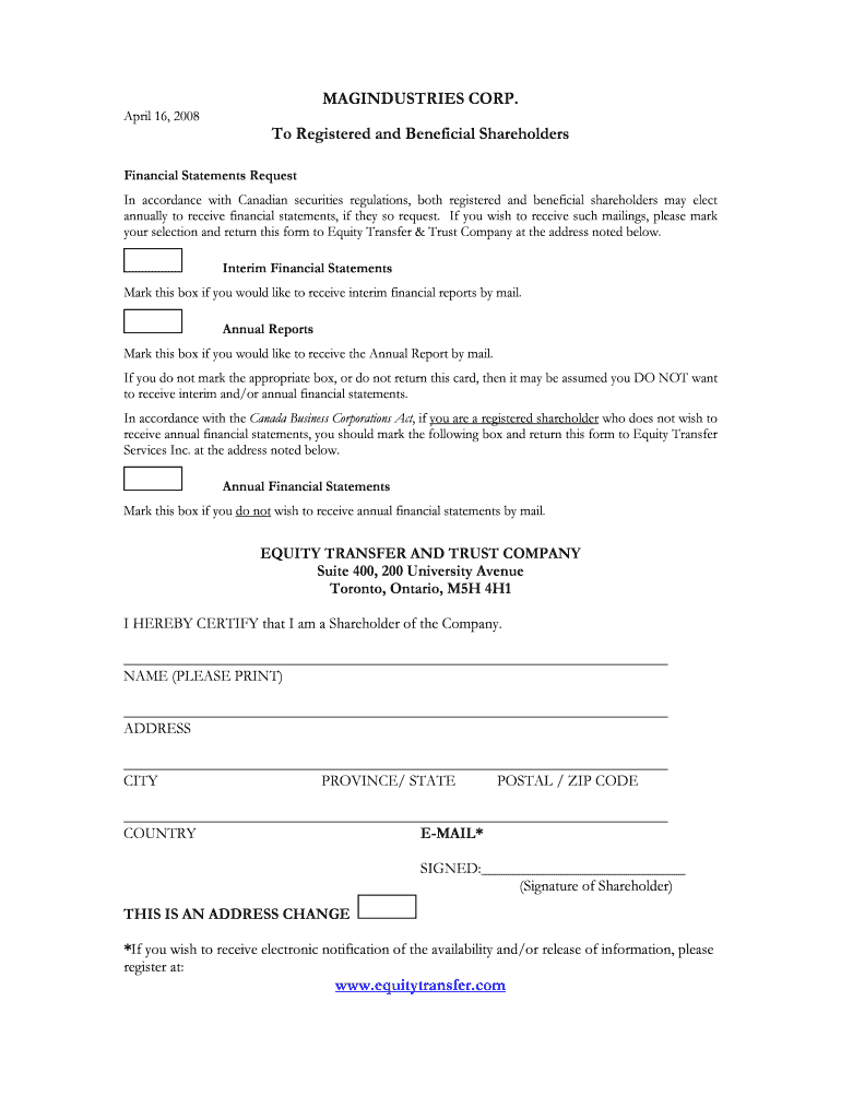 INDUSTRIES CORP. April 16, 2008, To Registered and Beneficial Shareholders Financial Statements Request In accordance with Canadian securities regulations, both registered and beneficial shareholders