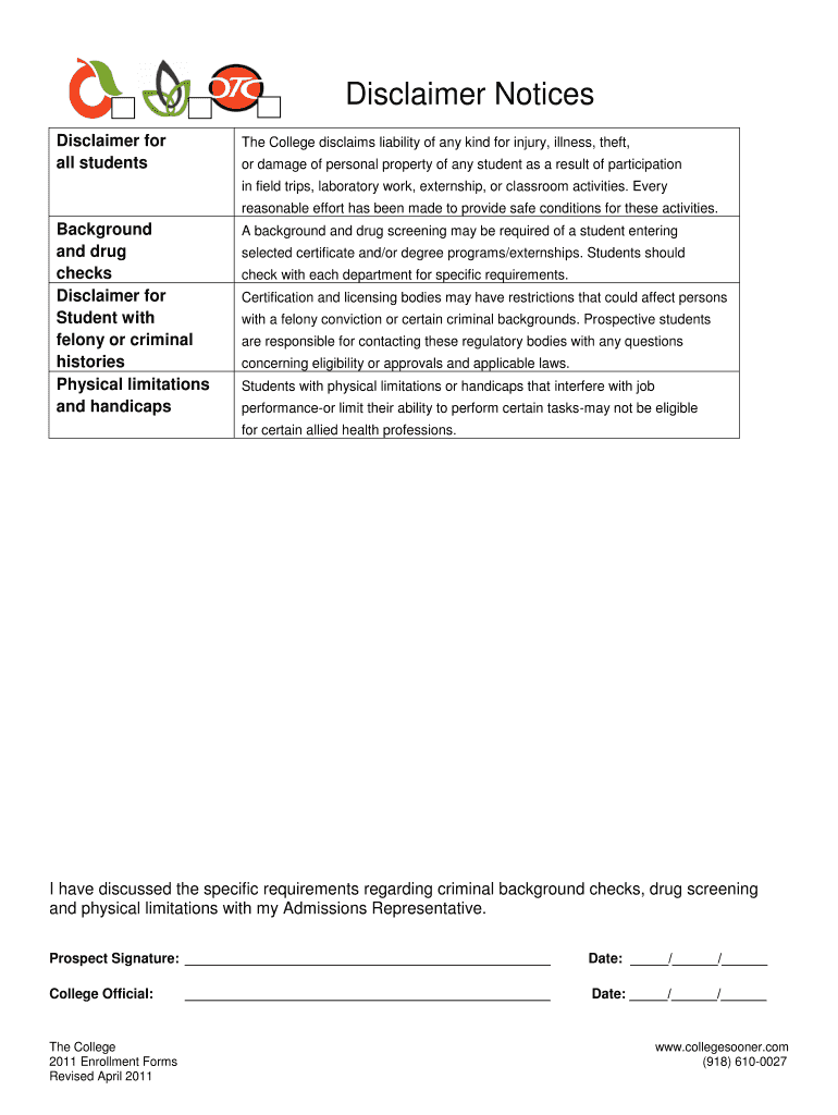 Disclaimer Notices Disclaimer for all students The College disclaims liability of any kind for injury, illness, theft, or damage to personal property of any student as a result of participation in