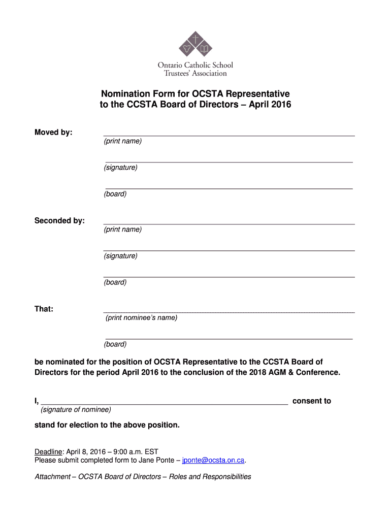 To fill out the nomination form for OCSTA, candidates must provide their personal information, the position they are running for, and any supporting documentation required.