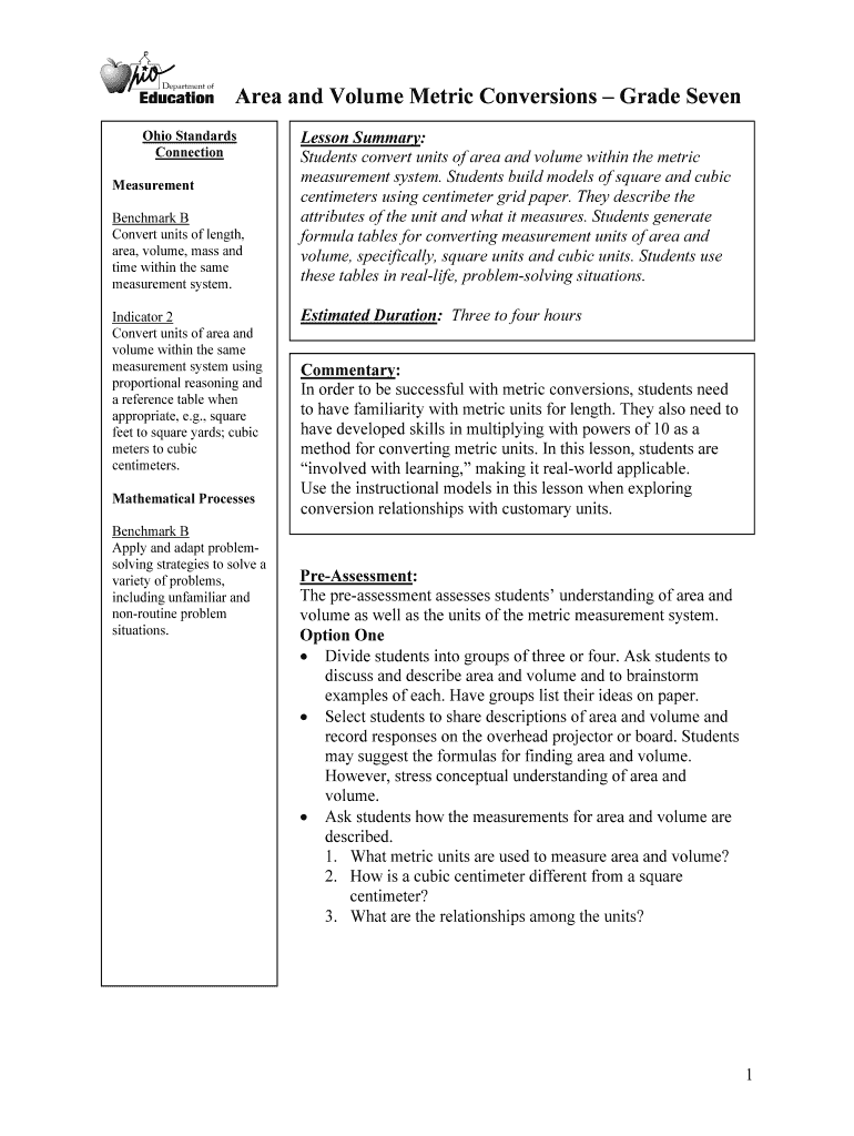 Get the free Area and Volume Metric Conversions Grade Seven - ims ode state oh