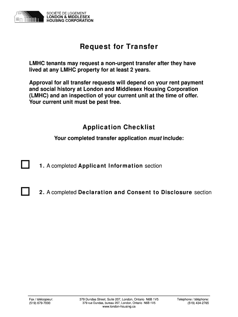 Request for Transfer MHC tenants may request a nonurgent transfer after they have lived at any MHC property for at least 2 years. Approval for all transfer requests will depend on your rent payment