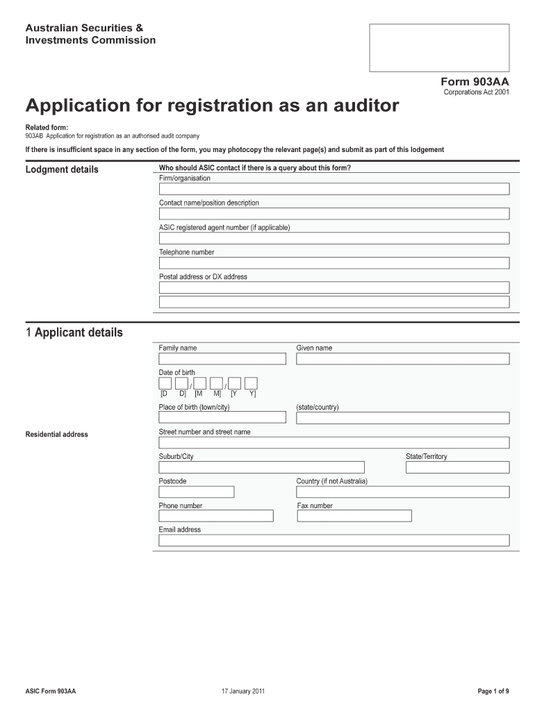 Australian Securities & Investments Commission Form 903AA Application for registration as an auditor Corporations Act 2001 Related form: 903AB Application for registration as an authorized audit company