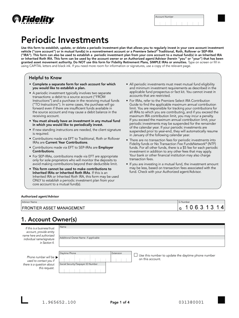 Print Reset Account Number Periodic Investments Use this form to establish, update, or delete a periodic investment plan that allows you to regularly invest in your core account investment vehicle