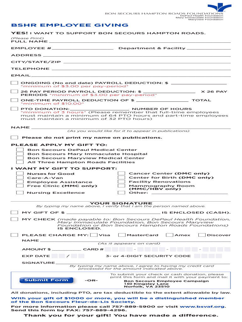 Get the free BSHR EMPLOYEE GIVING - bsvaforg