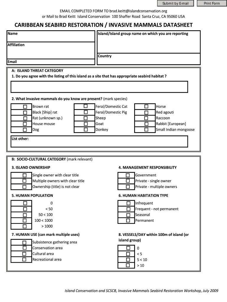 The caribbean seabird restoration invasive form can be filled out online or submitted via mail. It requires detailed information about the restoration efforts being undertaken.