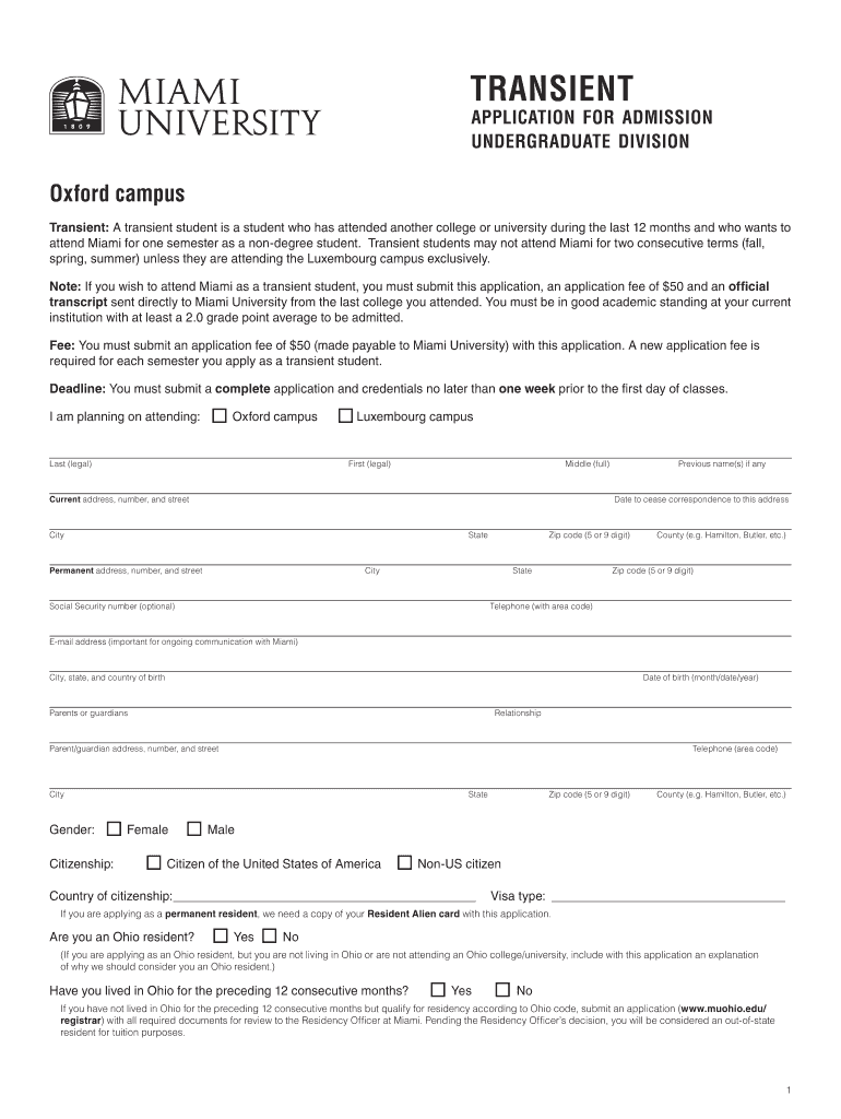 TRANSIENT APPLICATION FOR ADMISSION UNDERGRADUATE DIVISION Oxford campus Transient: A transient student is a student who has attended another college or university during the last 12 months and who