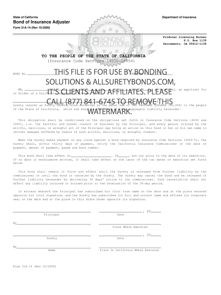 To ensure adjusters' honesty and compliance with California statutes, a bond is required as a financial guarantee. Under this bond agreement, if an insurance adjuster violate these statutes, leading to harms or losses for their clients, a claim can be filed against their bond.