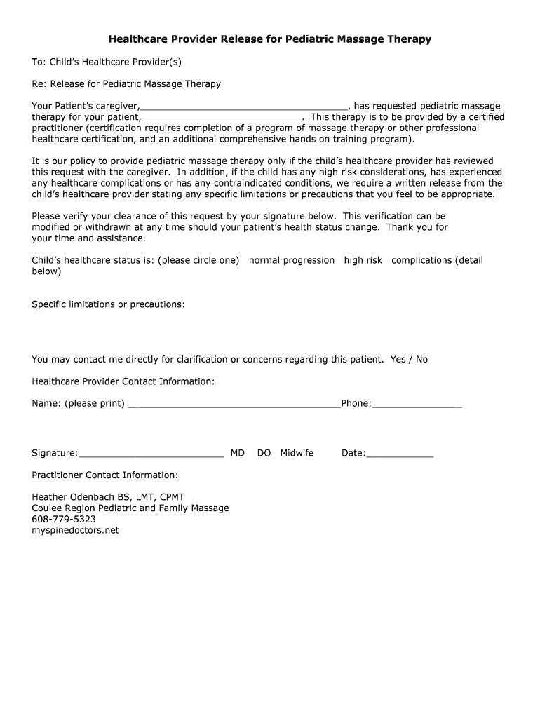Healthcare Provider Release for Pediatric Massage Therapy To: Child's Healthcare Provider(s) Re: Release for Pediatric Massage Therapy Your Patients caregiver, has requested pediatric massage therapy