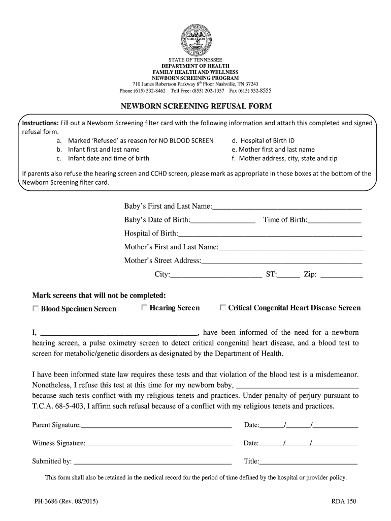 Get the free Newborn bScreeningb Refusal bFormb - State of Tennessee - tn