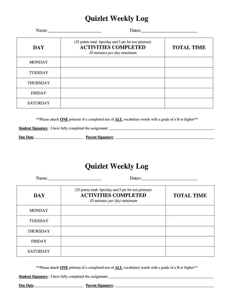 Quizlet weekly log must include details of the activities completed, time spent studying, and any improvements or challenges faced during the week.