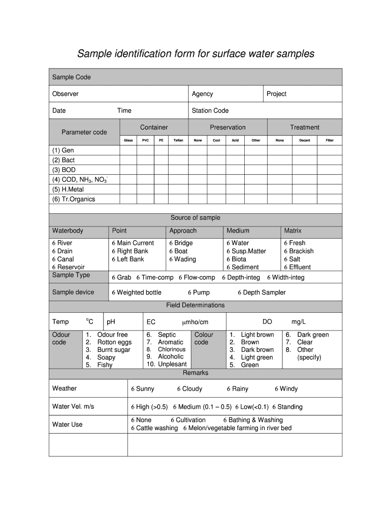 Sample identification form for surface water samples Sample Code Observer Agency Date Time Station Code Container Parameter code Glass Project PVC PE Preservation Teflon None Cool Acid Treatment Other