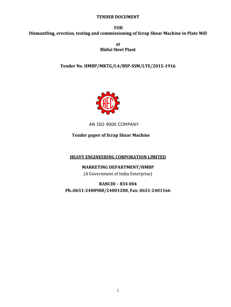TENDER DOCUMENT FOR Dismantling, erection, testing and commissioning of Scrap Shear Machine in Plate Mill at Bhilai Steel Plant Tender No. HBP/MKT/I.4/BSP SSM/LTE/20151916AN ISO 9000 COMPANYTender