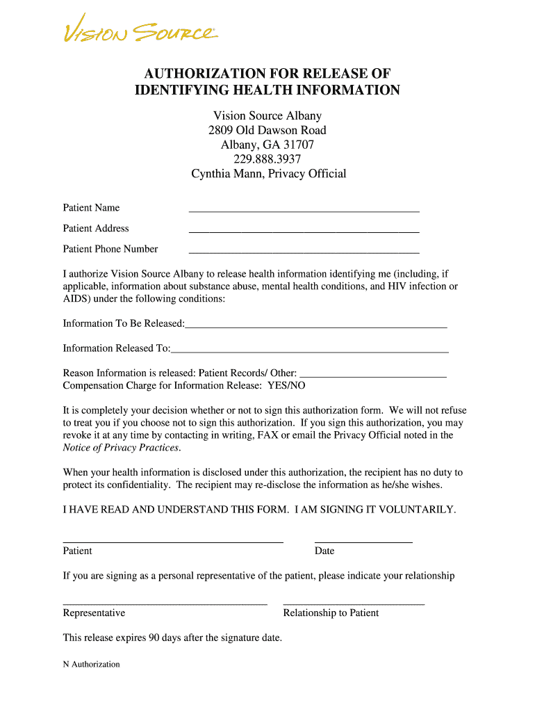 AUTHORIZATION FOR RELEASE OF IDENTIFYING HEALTH INFORMATION Vision Source Albany 2809 Old Dawson Road Albany, GA 31707 229.888.3937 Cynthia Mann, Privacy Official Patient Name Patient Address Patient
