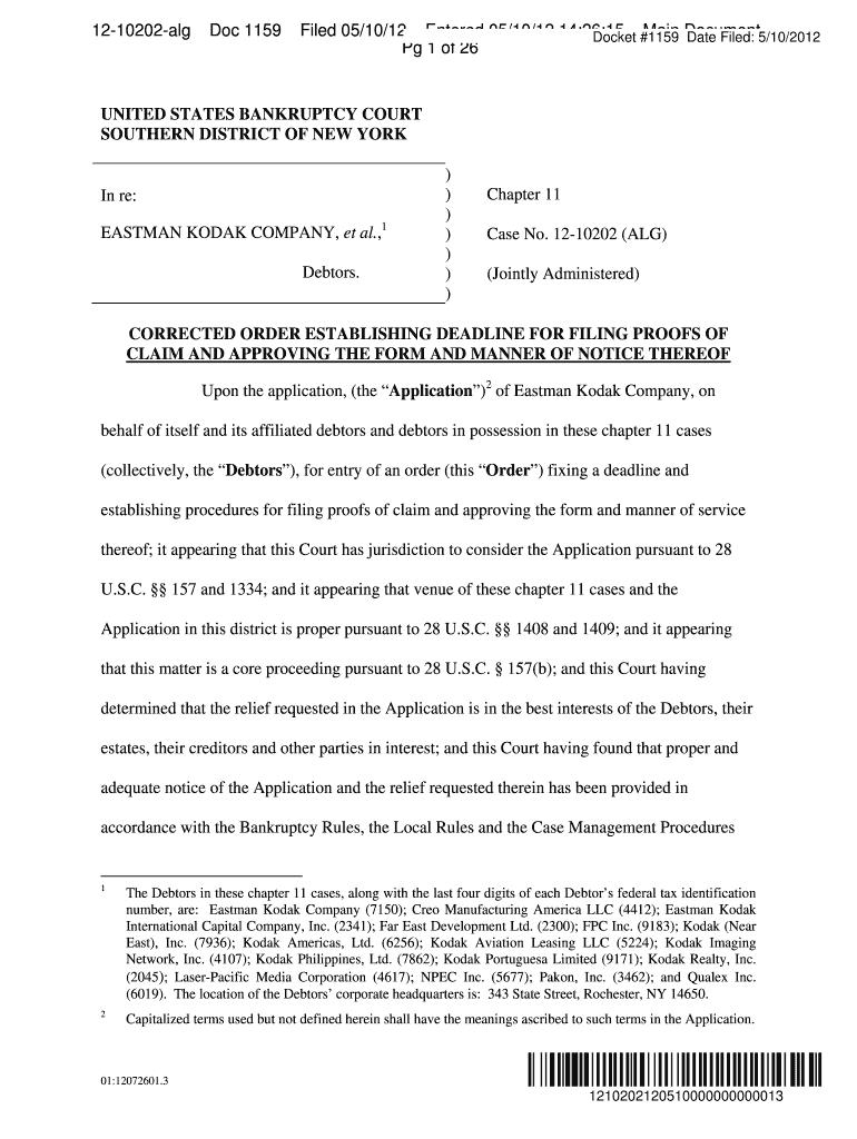 1210202alg Doc 1159 Filed 05/10/12 Entered 05/10/12 14:26:15 #1159 Document5/10/2012 Docket Main Date Filed: Pg 1 of 26 UNITED STATES BANKRUPTCY COURT SOUTHERN DISTRICT OF NEW YORK In re: EASTMAN