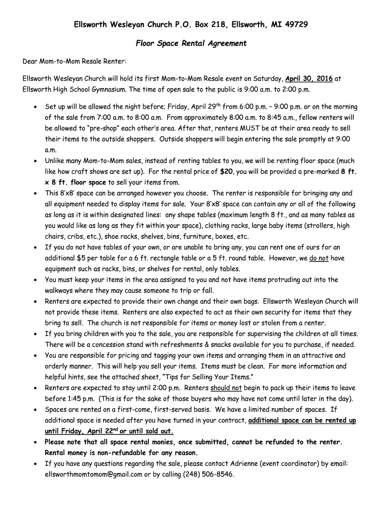 Ellsworth Wesleyan Church P.O. Box 218, Ellsworth, MI 49729-Floor Space Rental Agreement Dear Matomo Resale Renter: Ellsworth Wesleyan Church will hold its first Matomo Resale event on Saturday, April