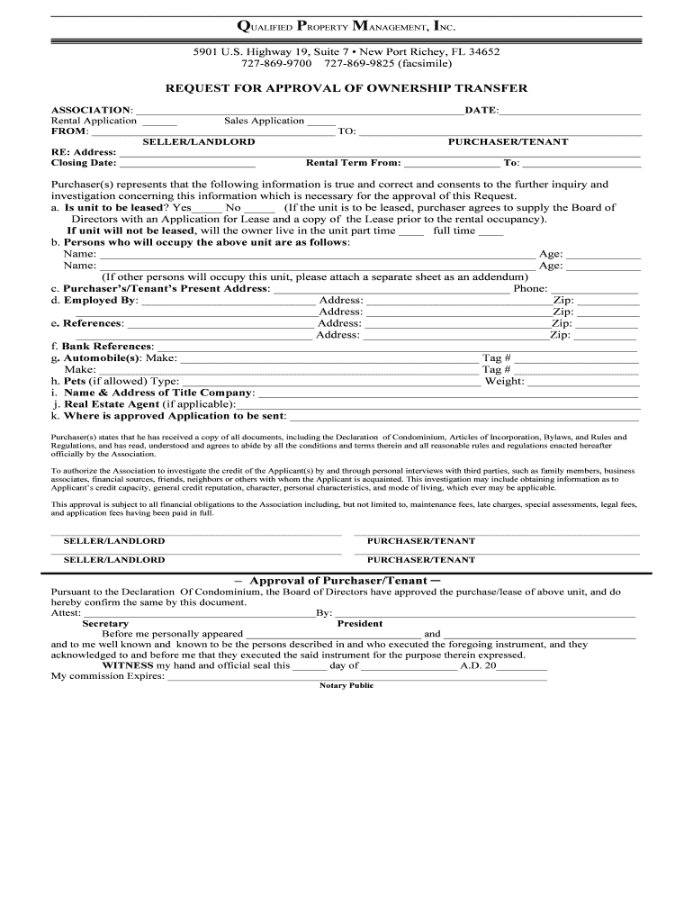 QUALIFIED PROPERTY MANAGEMENT, INC. 5901 U.S. Highway 19, Suite 7 New Port Richey, FL 34652 7278699700 7278699825 (facsimile) REQUEST FOR APPROVAL OF OWNERSHIP TRANSFER ASSOCIATION: DATE: Rental Application
