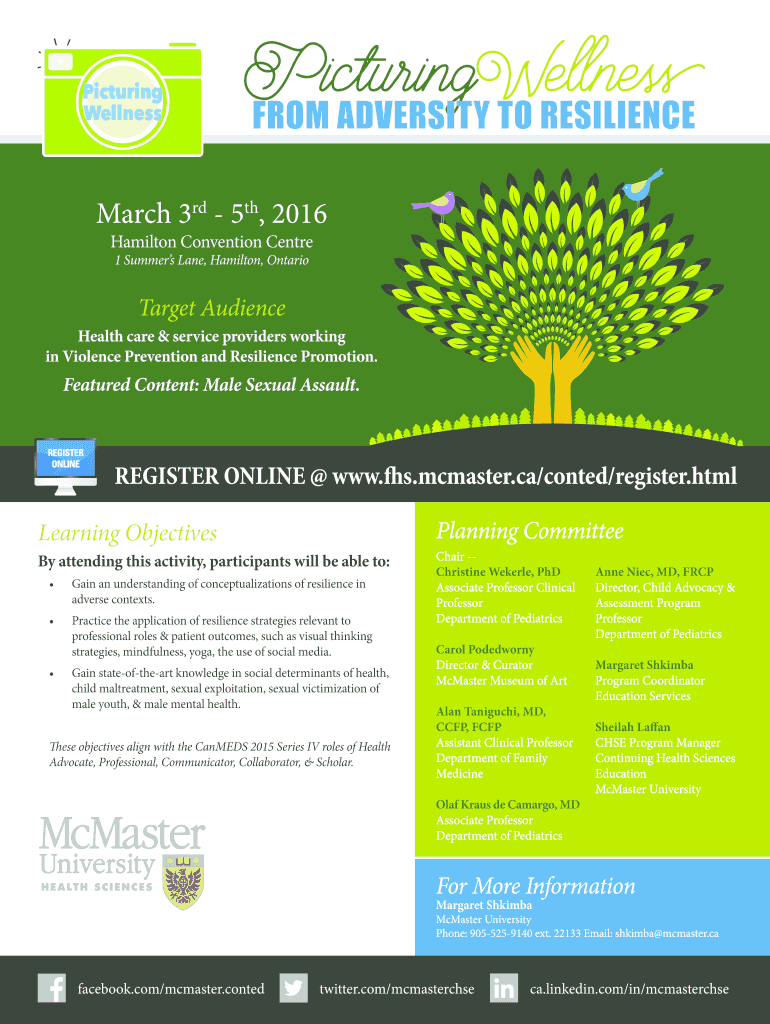 PicturingWellness FROM ADVERSITY TO RESILIENCE March 3rd 5th, 2016 Hamilton Convention Center 1 Summers Lane, Hamilton, Ontario Target Audience Health care & service providers working in Violence