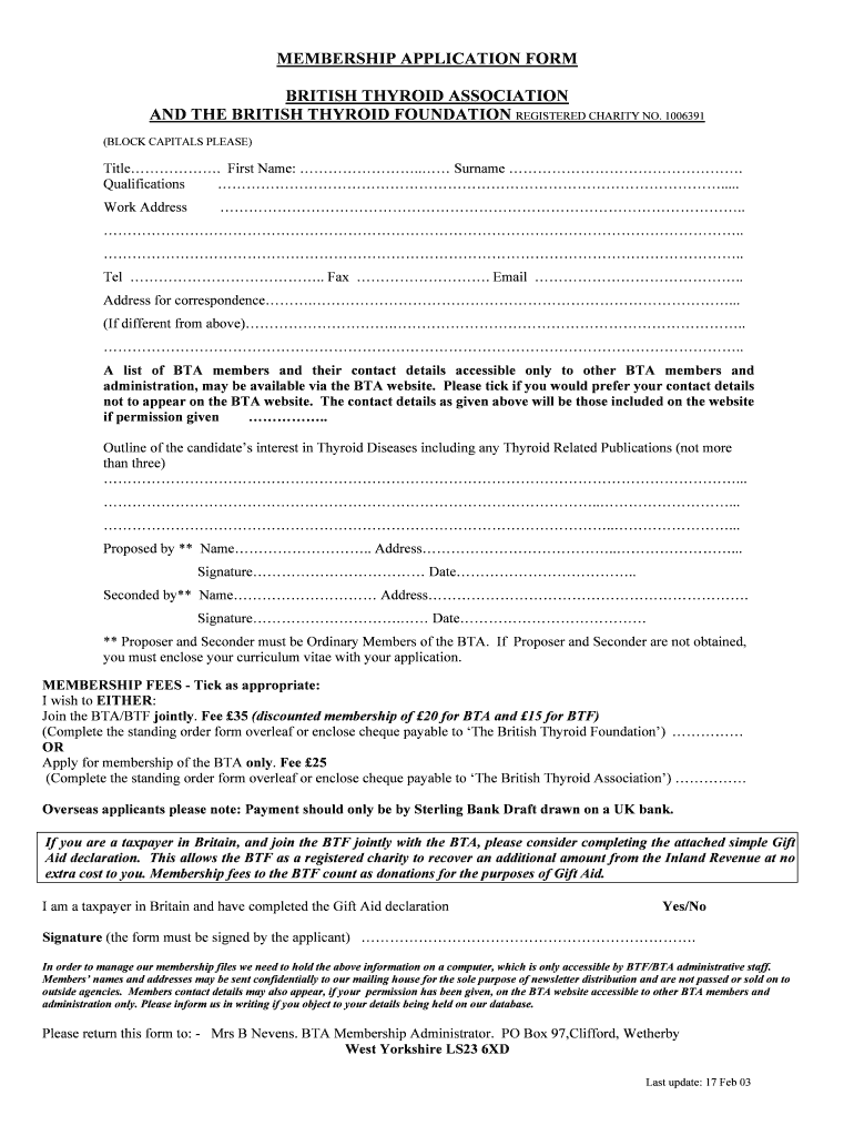 MEMBERSHIP APPLICATION FORM BRITISH THYROID ASSOCIATION AND THE BRITISH THYROID FOUNDATION REGISTERED CHARITY NO. 1006391 (BLOCK CAPITALS PLEASE) Title. First Name:. Surname. Qualifications .....