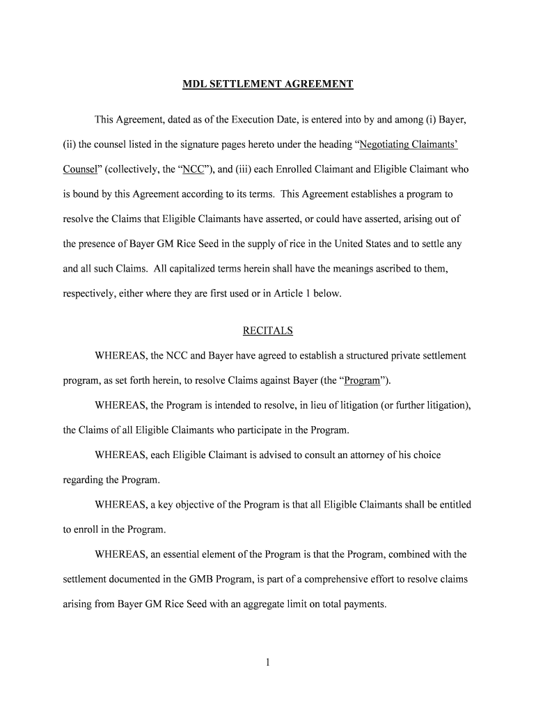 MDL SETTLEMENT AGREEMENT This Agreement, dated as of the Execution Date, is entered into by and among (i) Bayer, (ii) the counsel listed in the signature pages hereto under the heading Negotiating