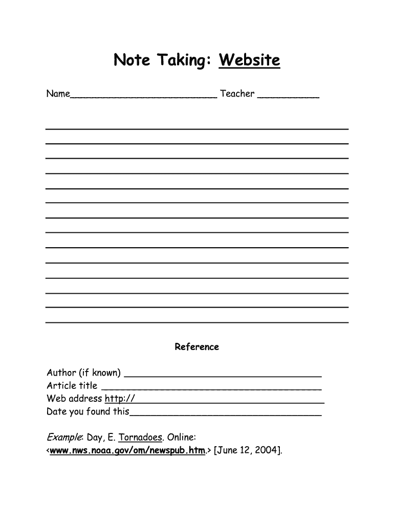 Note-Taking: Website Name Teacher Reference Author (if known) Article title Web address http:// Date you found this Example: Day, E. Tornadoes. Online: www.nws.noaa.gov/om/newspub.htm. June 12, 2004.