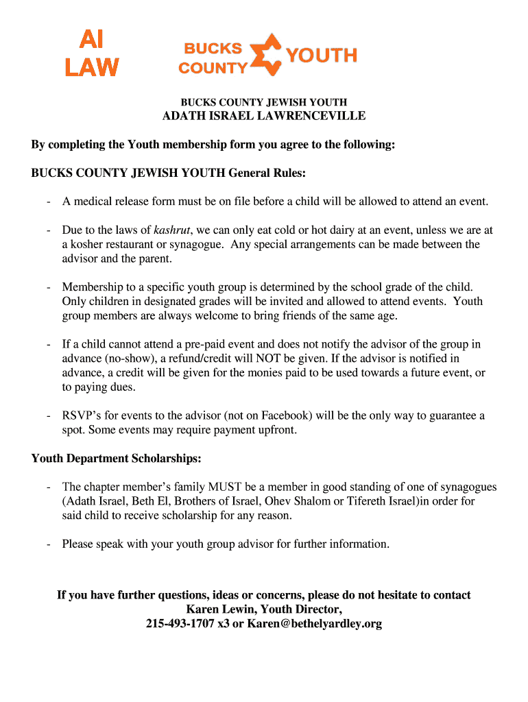 BUCKS COUNTY JEWISH YOUTH AD ATH ISRAEL LAWRENCEVILLE By completing the Youth membership form you agree to the following: BUCKS COUNTY JEWISH YOUTH General Rules: A medical release form must be on