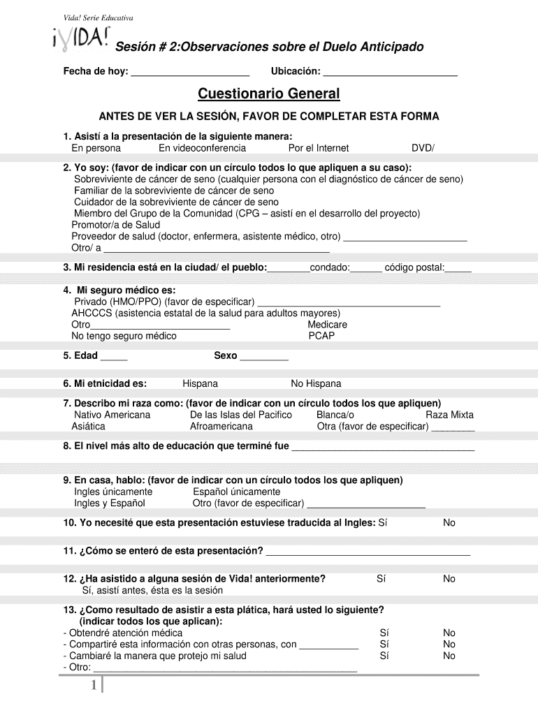 Vida! Series Educative Resin # 2:Observations sober El Duel Anticipate Tech DE how: Niacin: Cuestionario General ANTES DE VERY LA RESIN, FAVOR DE COMPLETER ESTA FORM 1. Assist à la presentation DE
