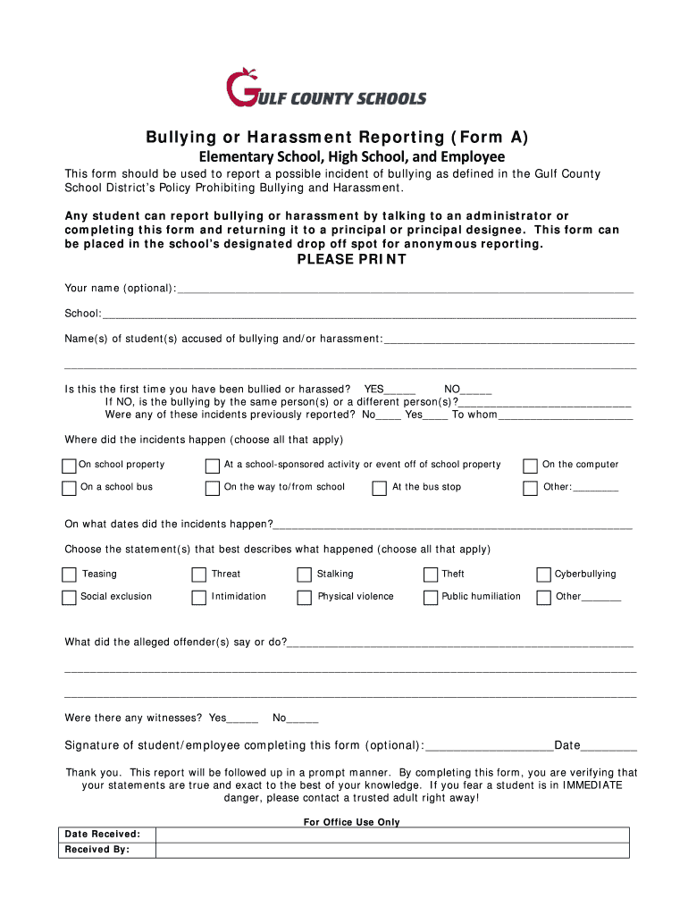 Bullying or Harassment Reporting (Form A) Elementary School, High School, and Employee This form should be used to report a possible incident of bullying as defined in the Gulf County School Districts