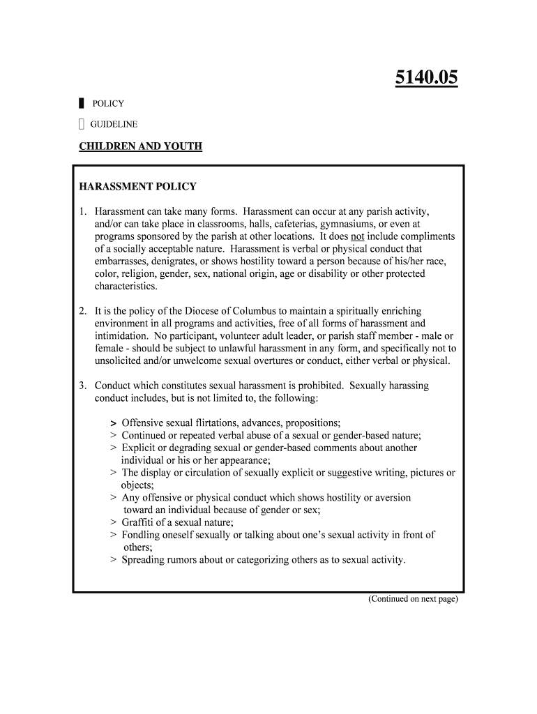 5140.05 POLICY GUIDELINE CHILDREN AND YOUTH HARASSMENT POLICY 1. Harassment can take many forms. Harassment can occur at any parish activity, and/or can take place in classrooms, halls, cafeterias,