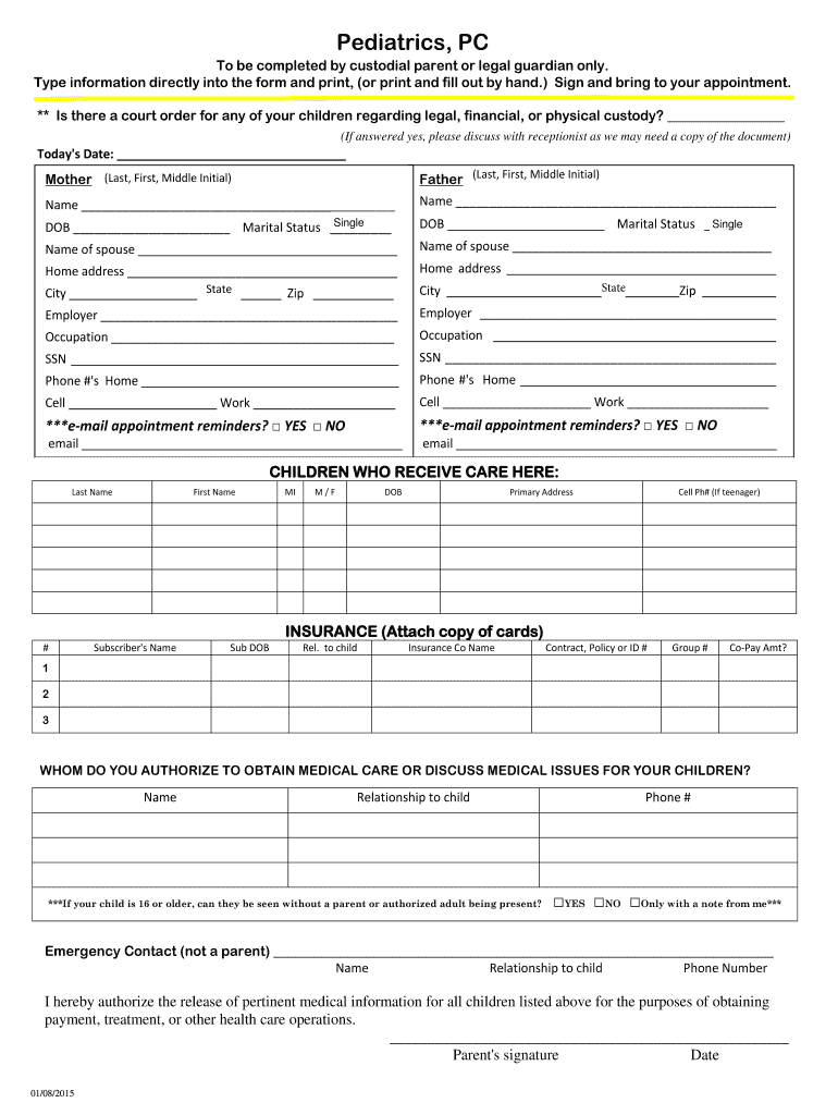 Pediatrics, PC To be completed by custodial parent or legal guardian only. Type information directly into the form and print, (or print and fill out by hand.) Sign and bring to your appointment. **