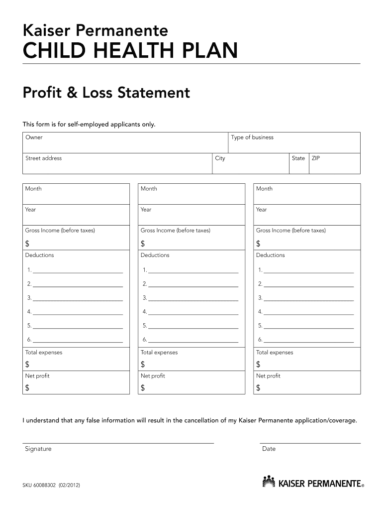 Kaiser Permanent CHILD HEALTH PLAN Profit & Loss Statement This form is for self-employed applicants only. Owner Type of business Street address City State ZIP Month Month Month Year Year Year Gross