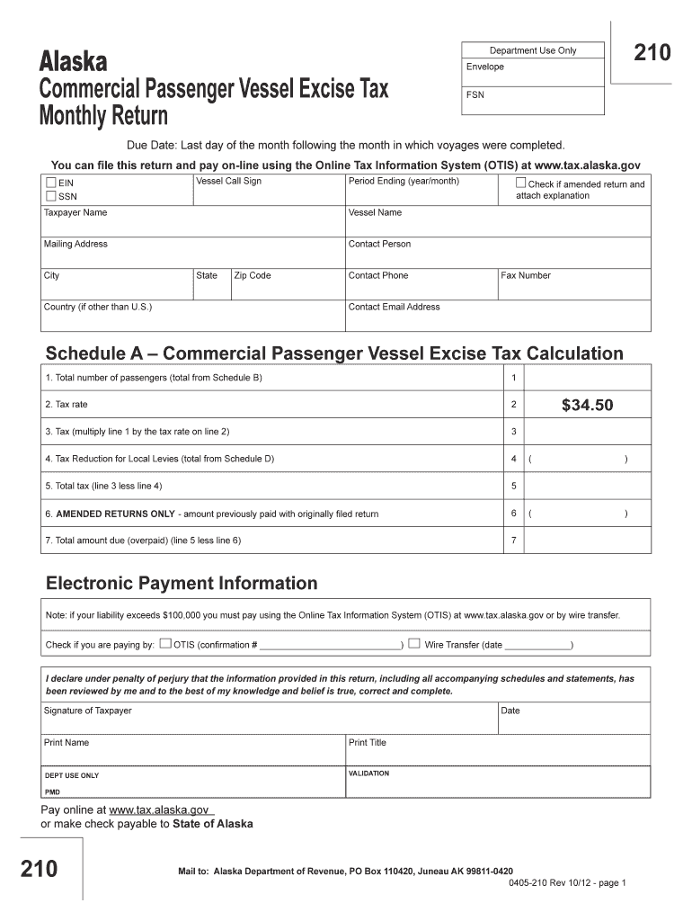 Save Reset Print Alaska Commercial Passenger Vessel Excise Tax Monthly Return 210 Department Use Only Envelope FSN Due Date: Last day of the month following the month in which voyages were completed.