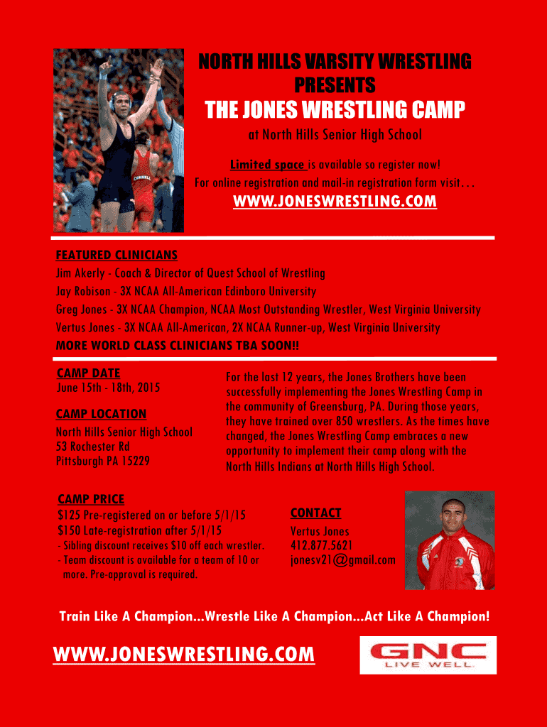 NORTH HILLS VARSITY WRESTLING PRESENTS THE JONES WRESTLING CAMP at North Hills Senior High School Limited space is available so register now! For online registration and mailing registration form