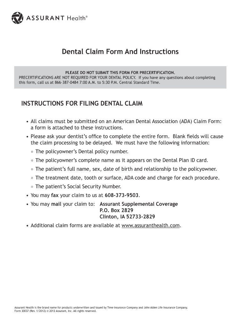 Dental Claim Form And Instructions PLEASE DO NOT SUBMIT THIS FORM FOR RECERTIFICATION. RECERTIFICATIONS ARE NOT REQUIRED FOR YOUR DENTAL POLICY. If you have any questions about completing this form,