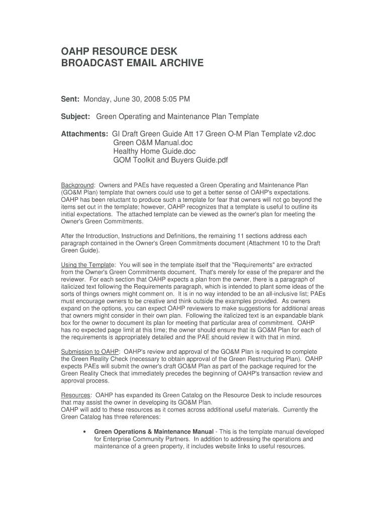 OAHU RESOURCE DESK BROADCAST EMAIL ARCHIVE Sent: Monday, June 30, 2008 5:05 PM Subject: Green Operating and Maintenance Plan Template Attachments: GI Draft Green Guide ATT 17 Green OM Plan Template