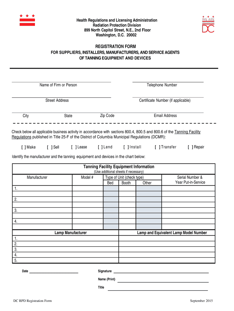 Health Regulations and Licensing Administration Radiation Protection Division 899 North Capitol Street, N.E., 2nd Floor Washington, D.C. 20002 REGISTRATION FORM FOR SUPPLIERS, INSTALLERS, MANUFACTURERS,