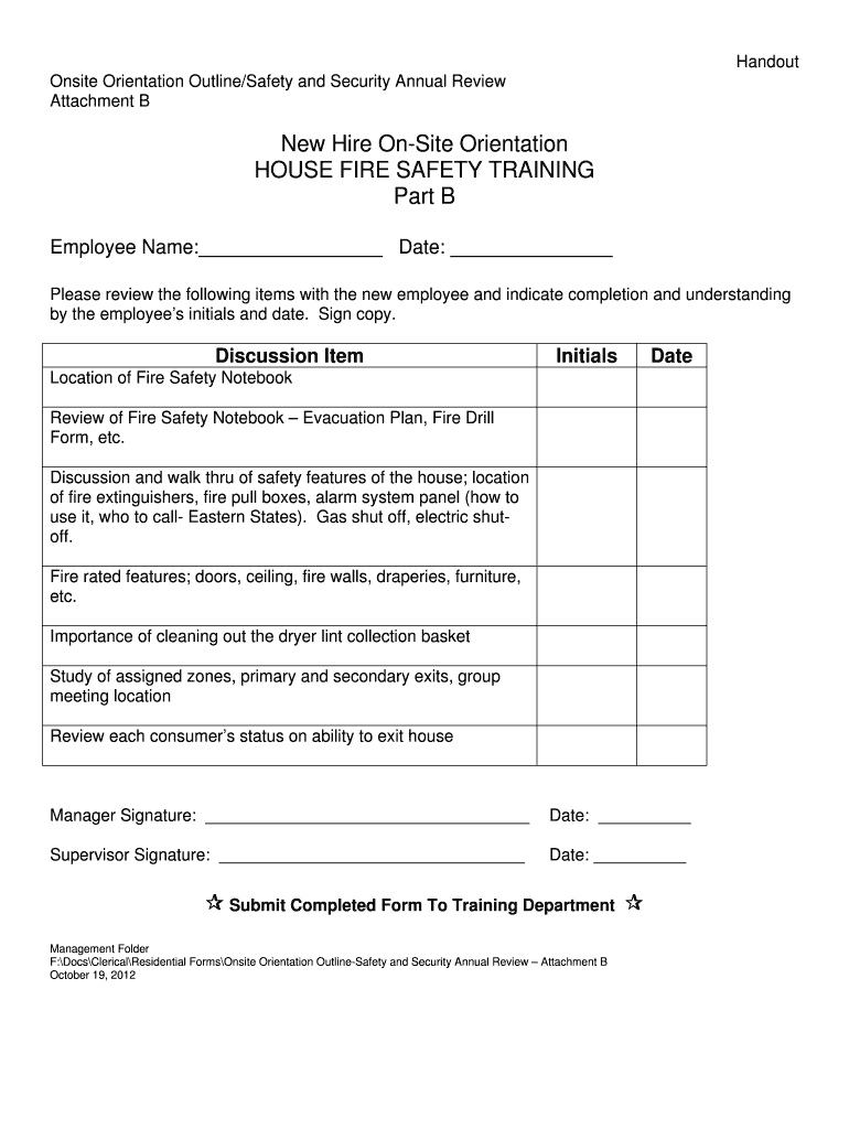 Handout Onsite Orientation Outline/Safety and Security Annual Review Attachment B New Hire Onsite Orientation HOUSE FIRE SAFETY TRAINING Part B Employee Name: Date: Please review the following items