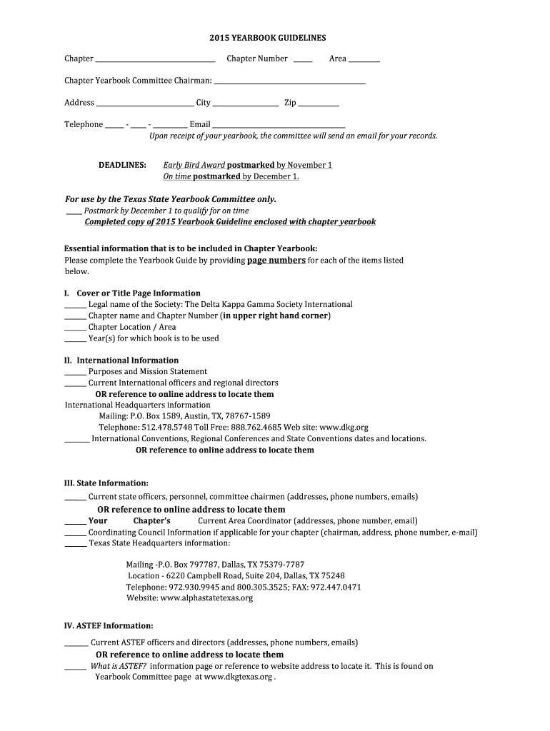 !! 2015%YEARBOOK%GUIDELINES%!! Chapter! !!!!!! Chapter! Number!!! !!!!!!!!! Area! !!! Chapter! Yearbook! Committee! Chairman:! !!! Address! ! City! !!! Zip! !!! Telephone! !;! !;! ! Email! !!! Upon%receipt%of%your%yearbook,