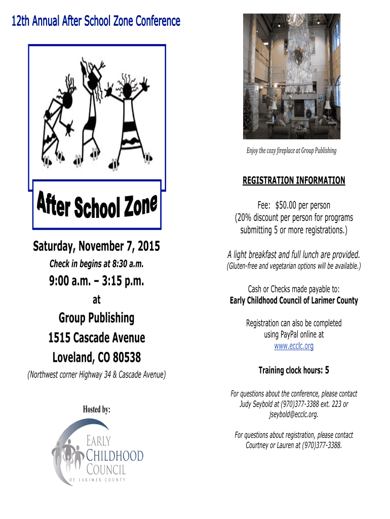 Enjoy the cozy fireplace at Group Publishing REGISTRATION INFORMATION Fee: $50.00 per person (20% discount per person for programs submitting 5 or more registrations.) Saturday, November 7, 2015,